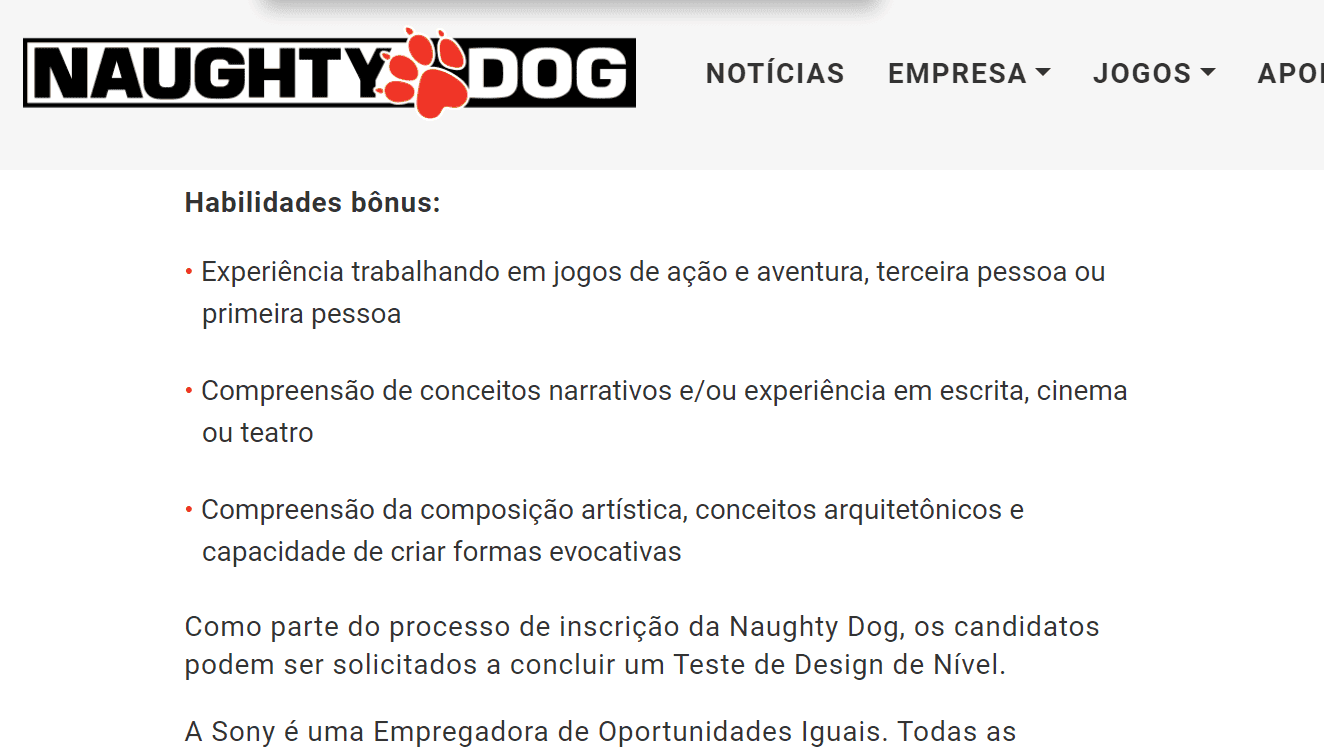 Uma nova oferta de emprego divulgada pela Naughty Dog, estúdio responsável por sucessos como The Last of Us e Uncharted, acendeu a especulação de que o próximo jogo da empresa pode ser seu primeiro título em primeira pessoa. A vaga, para um desenvolvedor de jogos de ação-aventura, destaca a experiência em jogos do gênero em primeira ou terceira pessoa como um diferencial importante para o candidato.