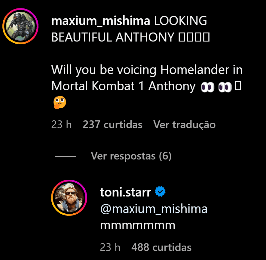 O ator Antony Starr, mais conhecido por seu papel como Homelander (Capitão Pátria) na série original da Amazon Prime Video, The Boys, baseada na série de quadrinhos homônima, pode também reprisar papel do personagem em Mortal Kombat 1, como aconteceu com John Cena e J.K. Simmons, que sãos os dubladores oficiais de Peacemaker e Omni-Man no game da NetherRealm Studios.