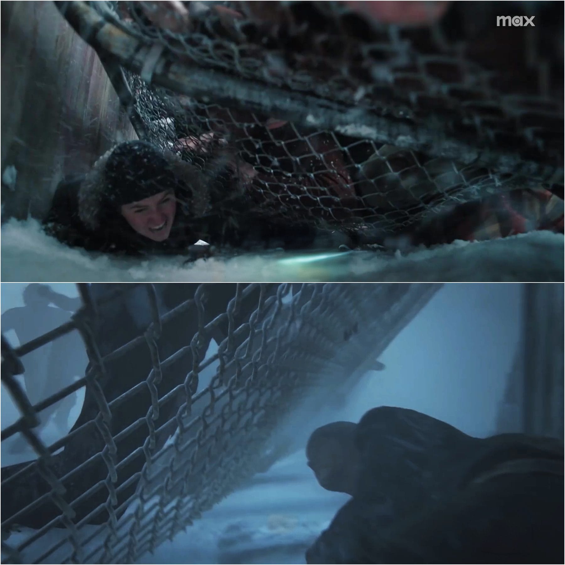 Em seguida temos Ellie vendo algo e gritando, enquanto uma pessoa põe a mão sobre seu ombro, podendo ser Maria. Há homens também, no fundo da sala. Essa cena parece ser de um evento inédito, se comparada ao game. Há quem possa pensar que ela está vendo aquela cena do momento catalisador da história de The Last of Us Part II, mas perceba que ela está coberta com o que parece não ser suas roupas.