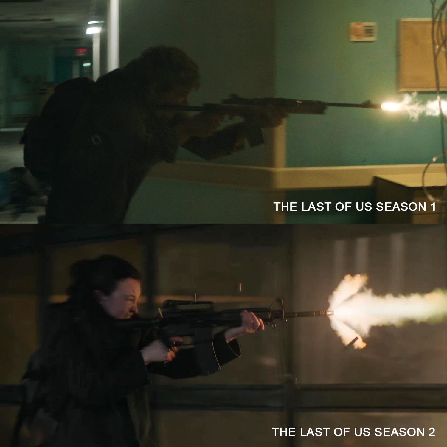 Aqui voltamos a ver a Ellie disparando um rifle de maneira frenética.