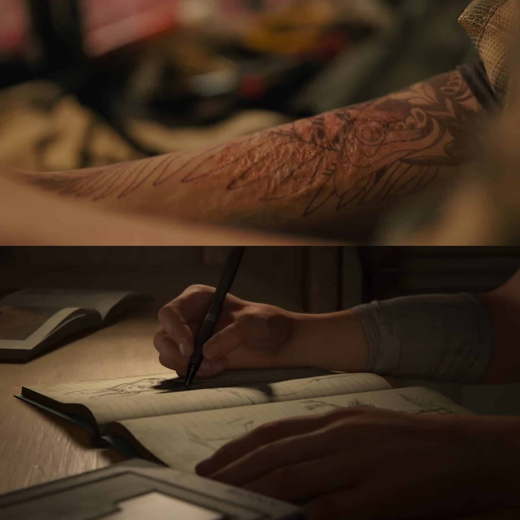 Em seguida temos a tattoo da Ellie, em cena também semelhante ao game em que ela aparece rabiscando seu diário, apesar de no game, nessa cena, Ellie ainda não ter sua tatuagem.