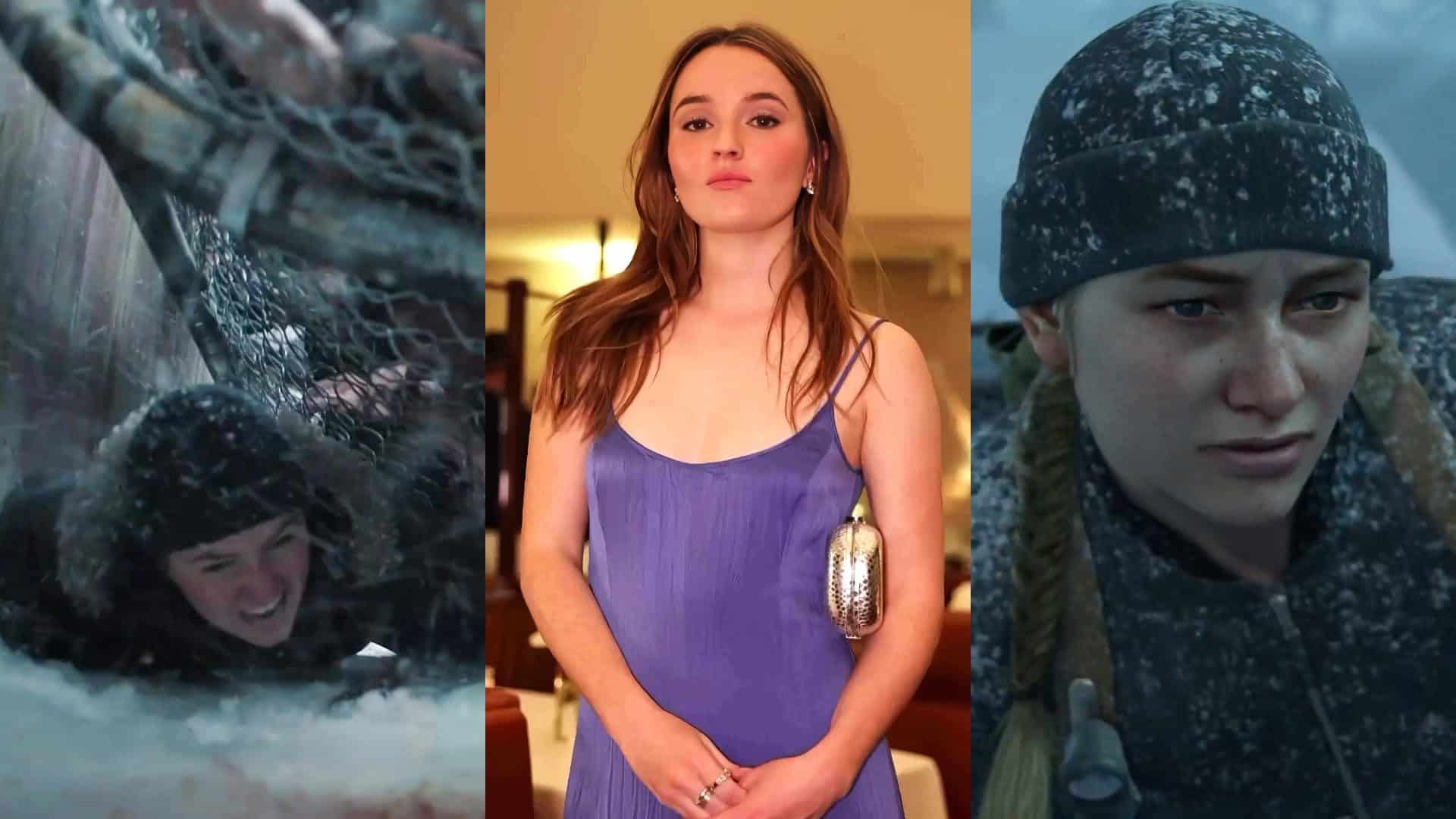 Agora, a fração de segundo mais discutida do vídeo. Kaitlyn Dever como Abby fugindo de uma horda de infectados sedentos por sangue. A cena evoca diretamente uma das sequências mais icônicas do segundo jogo.