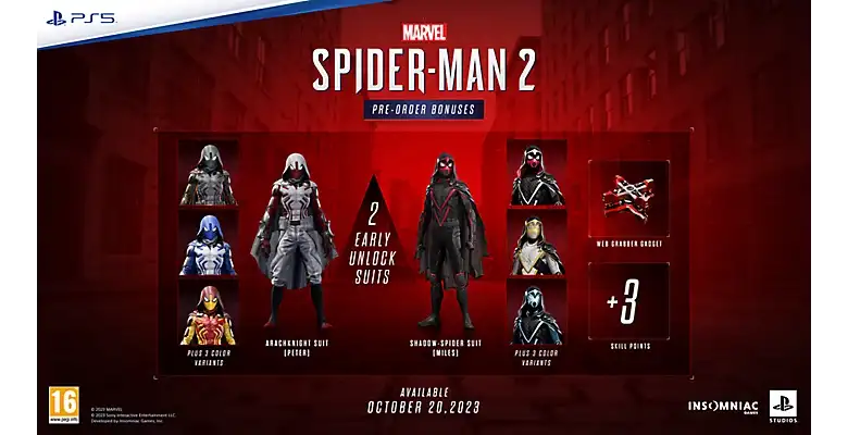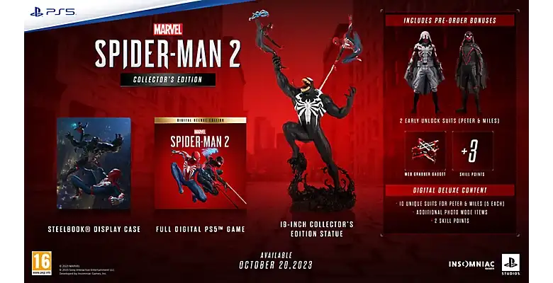 O exclusivo PS5 da Insomniac está sendo vendido em três edições. Todas vêm com um Arachknight Suit de desbloqueio antecipado para Peter Parker com três variantes de cores adicionais, um Shadow Spider Suit de desbloqueio antecipado para Miles Morales com três variantes de cores extras, um gadget Web Grabber de desbloqueio antecipado e mais três pontos de habilidade.