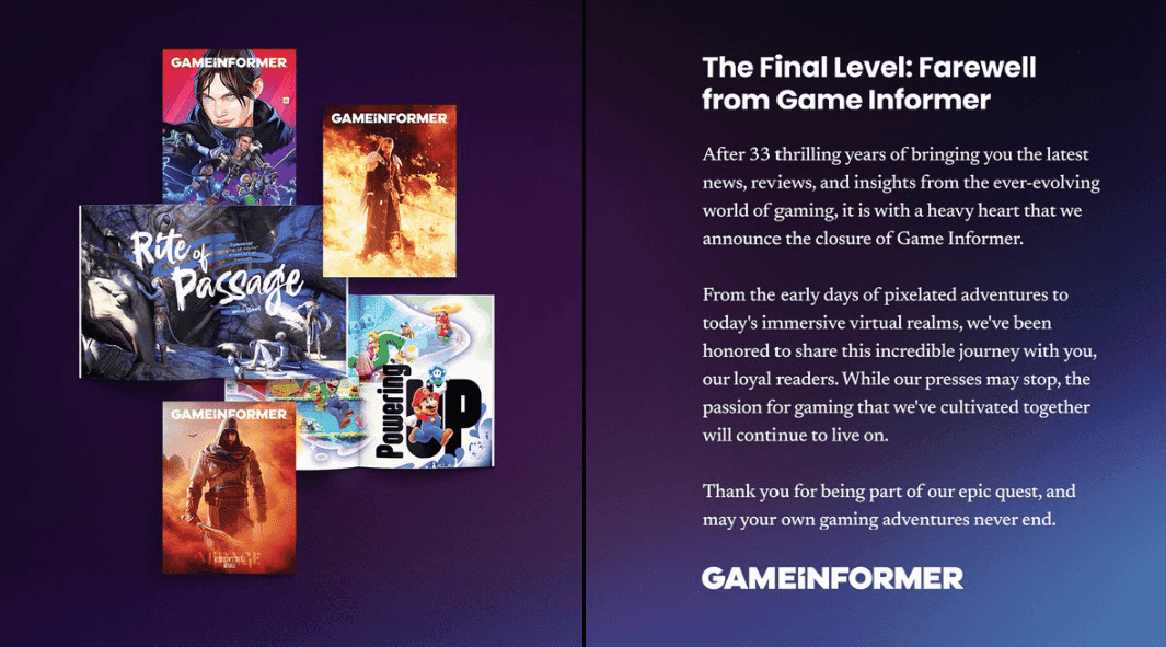 Após 33 anos emocionantes trazendo as últimas notícias, análises e insights do mundo em constante evolução dos jogos, é com o coração pesado que anunciamos o fechamento da Game Informer.