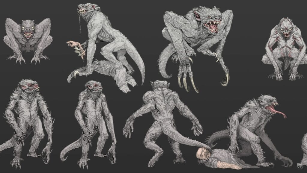 Para o design dos Sinistros, a gente tirou muita inspiração do ambiente. A gente se inspirou muito em lagartos, criaturas que fazem parte daquele ambiente. Eles tem garras enormes. Tem desde criaturas pequenas a bem grandes, a gente quis moldar bastante essa raça par aparecer que ela faz parte do ambiente que aquele reino é habitado e que o ecossistema é bastante diversificado.