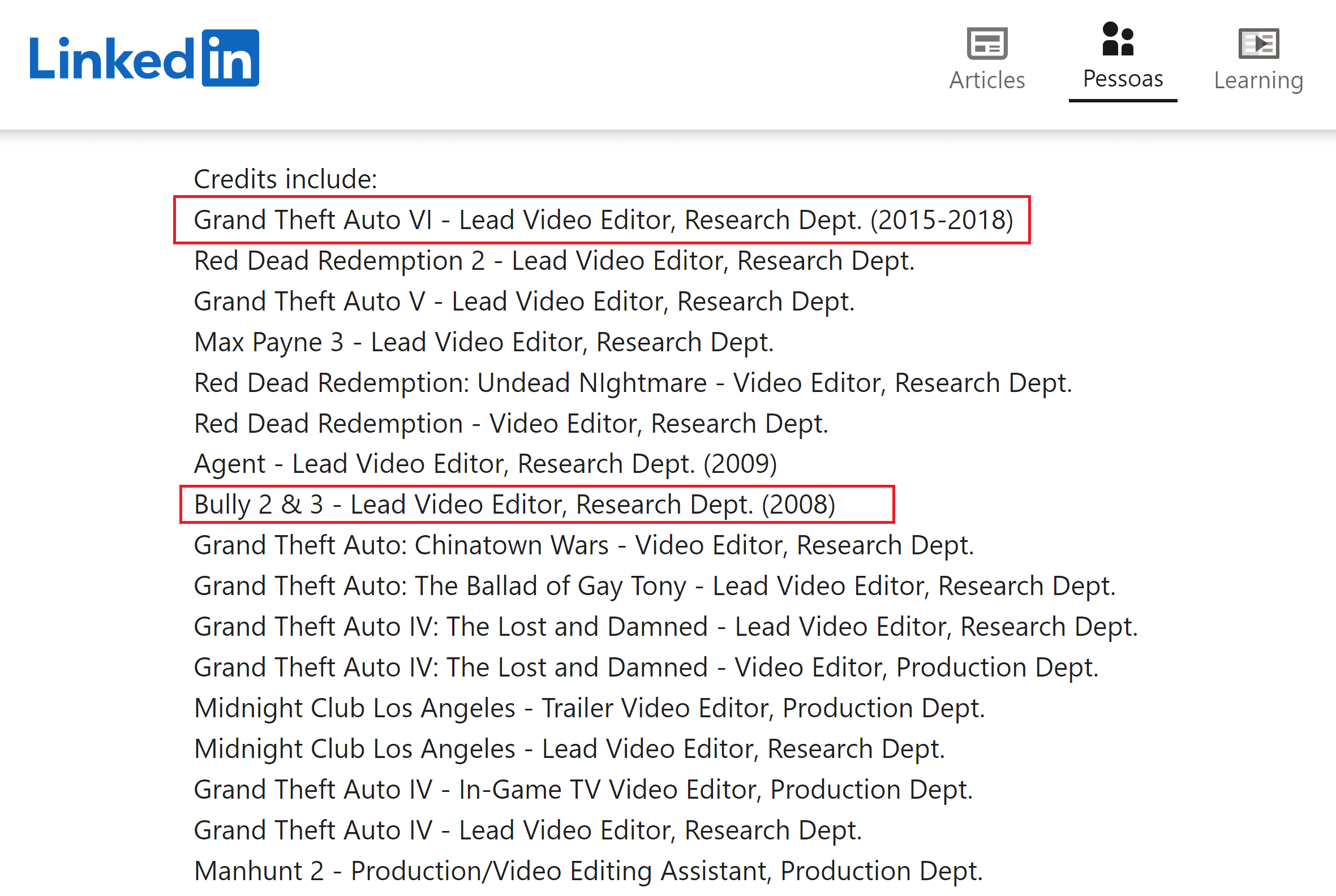 O currículo do desenvolvedor também confirma que GTA 6 está em desenvolvimento há quase uma década (desde 2015), onde ele lista ter trabalhado no jogo por três anos, até sua saída em 2018.