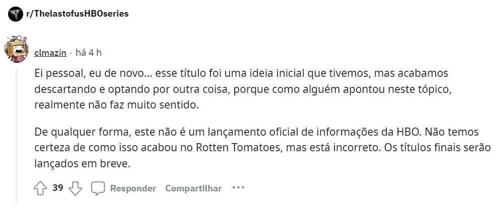 “Foi uma ideia inicial, mas acabamos descartando e optando por outra coisa… Não temos certeza de como isso acabou no RT, mas está incorreto. Os títulos finais serão lançados em breve.”