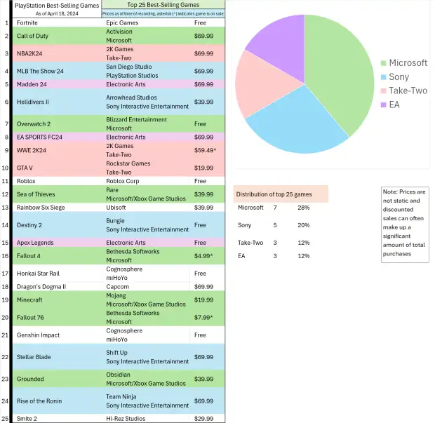 Conforme observado pelo tweaktown, segundo as listagens da PS Store no console PS5, até 18 de abril, a Microsoft tinha 7 dos 25 jogos mais vendidos na PlayStation Store. Isso inclui 2 jogos Fallout (Fallout 4 em 16º e Fallout 76 em 20º, respectivamente), Call of Duty em 2º, Overwatch 2 em 7º, Minecraft em 19º e dois jogos separados que recentemente quebraram a exclusividade: Sea of Thieves em 12º (em pré-venda) e Grounded em 23º. A Sony, por outro lado, tinha apenas 5 jogos na lista dos mais vendidos, dois dos quais não são tecnicamente jogos originais e publicados pela Sony Interactive Entertainment (Helldivers II foi desenvolvido pela Arrowhead Studios e Stellar Blade pela Shift Up). A publicação ressalta também que os 7 jogos associados à Microsoft são todos de grupos próprios; mesmo sendo divisões de integração limitada, tanto a ZeniMax (Bethesda) quanto a Activision Blizzard King são propriedade da Microsoft.
