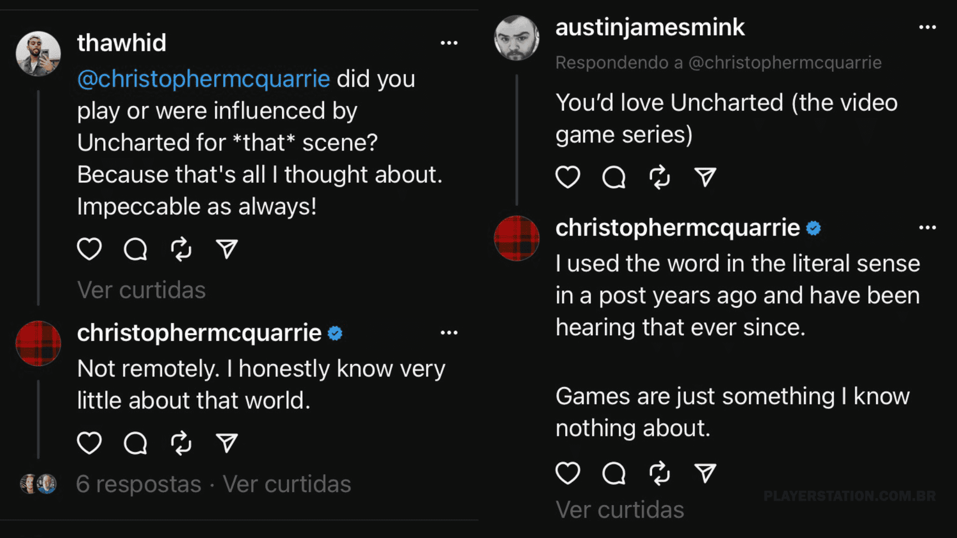 Através do Threads, nova plataforma social da Meta, semelhante ao Twitter, McQuarrie disse que a sequência de cenas do trem no longa não foi nem “remotamente” influenciada por Uncharted 2. Ele também esclareceu um comentário que fez há alguns anos, quando disse que se inspirou em Uncharted 3: Drake’s Deception (2011) para a sequência de cenas do avião em Missão Impossível: Nação Secreta (2015).