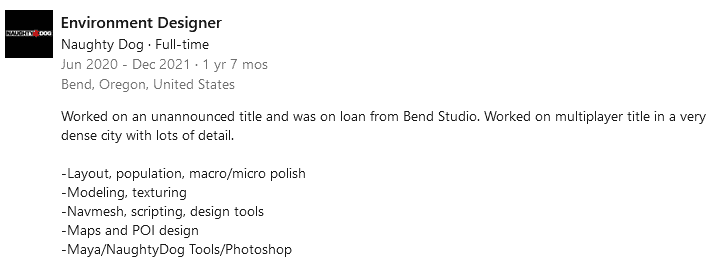 Um nova informação, no currículo de Mathew Seymour no LinkedIn, designer de ambiente da Bend Studios que trabalhou em um título não anunciado da Naughty Dog entre junho de 2020 e dezembro de 2021, menciona jogo multiplayer em uma cidade muito densa e com muitos detalhes. Sua contribuição para o projeto envolveu layout, população, macro/micropolimento, modelagem e texturização de ambientes. Designer também lista em seu perfil que trabalhou na malha de navegação para IA, fez alguns scripts, design de mapas e POI.
