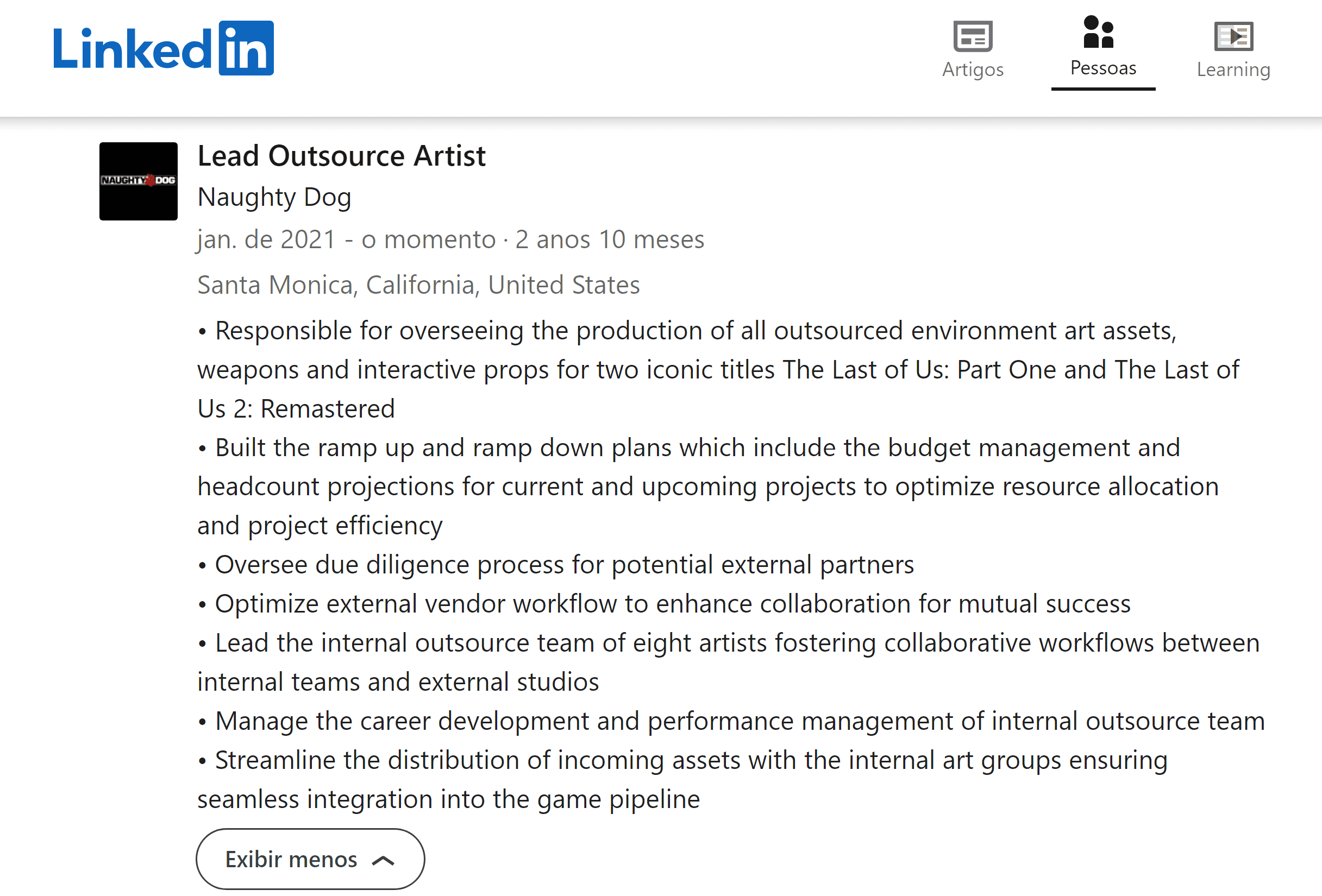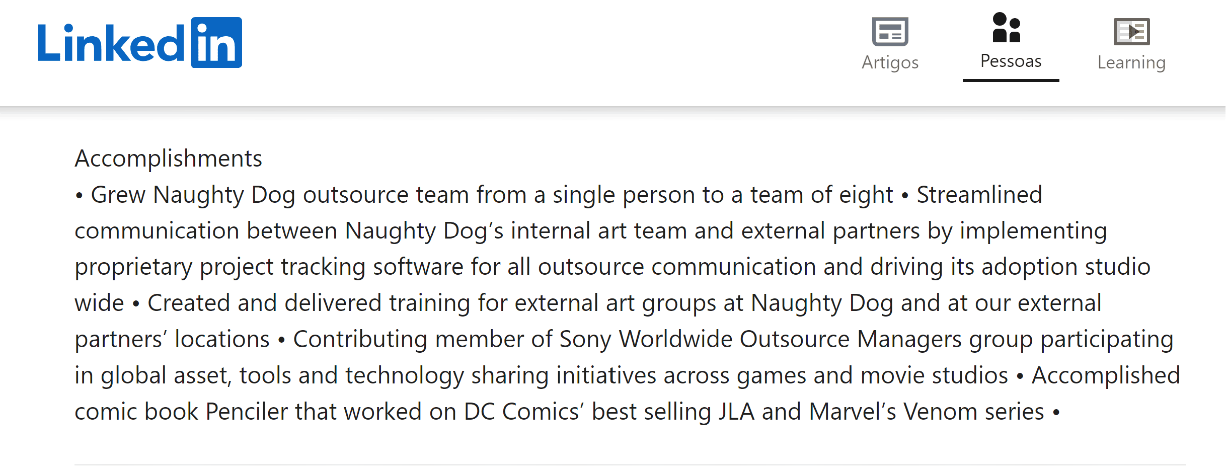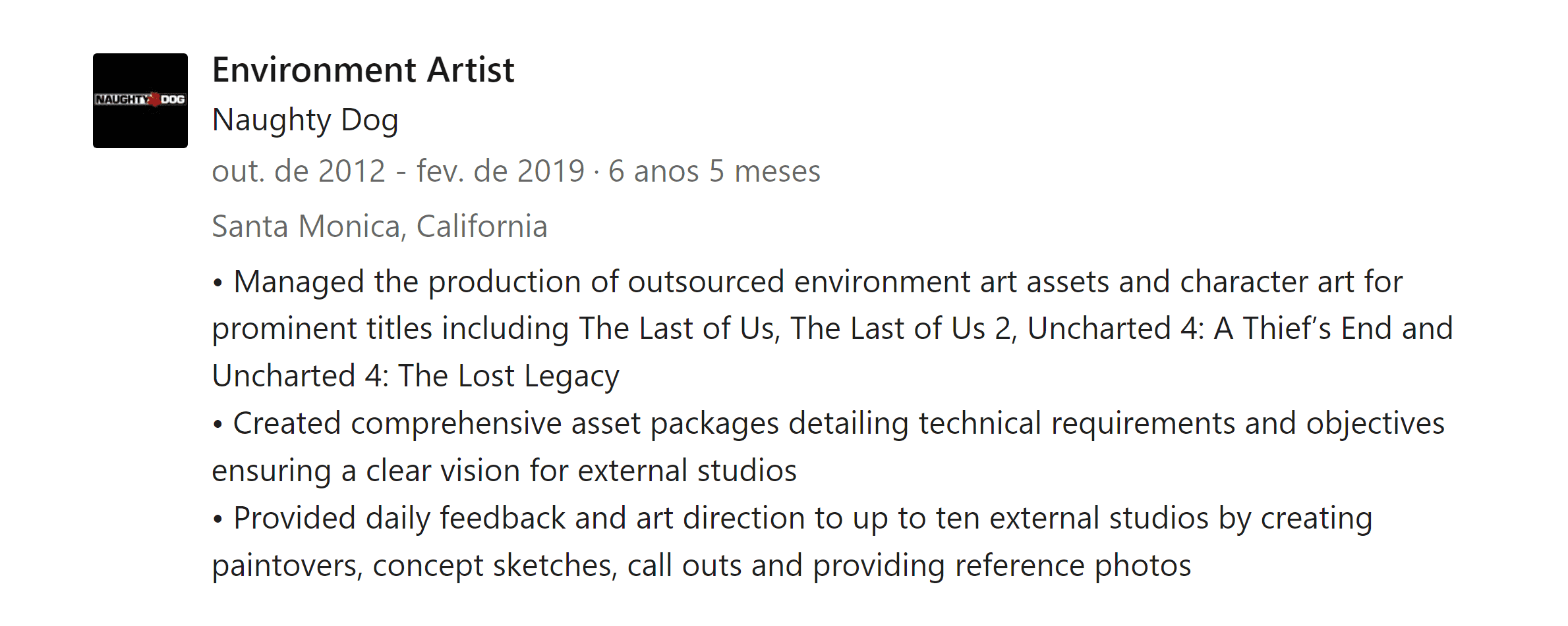 Segundo seu currículo, ele “aumentou a equipe de terceirização da Naughty Dog de uma única pessoa para uma equipe de oito pessoas”.