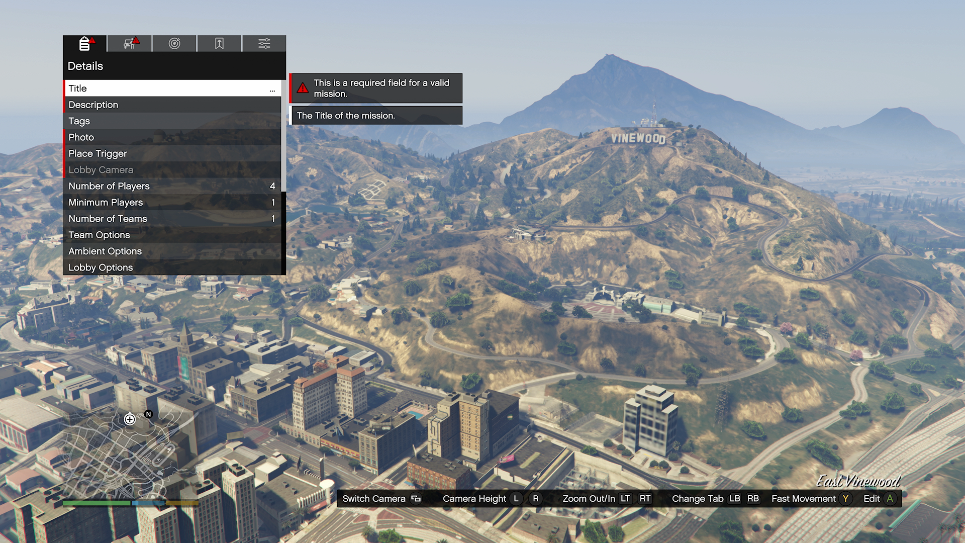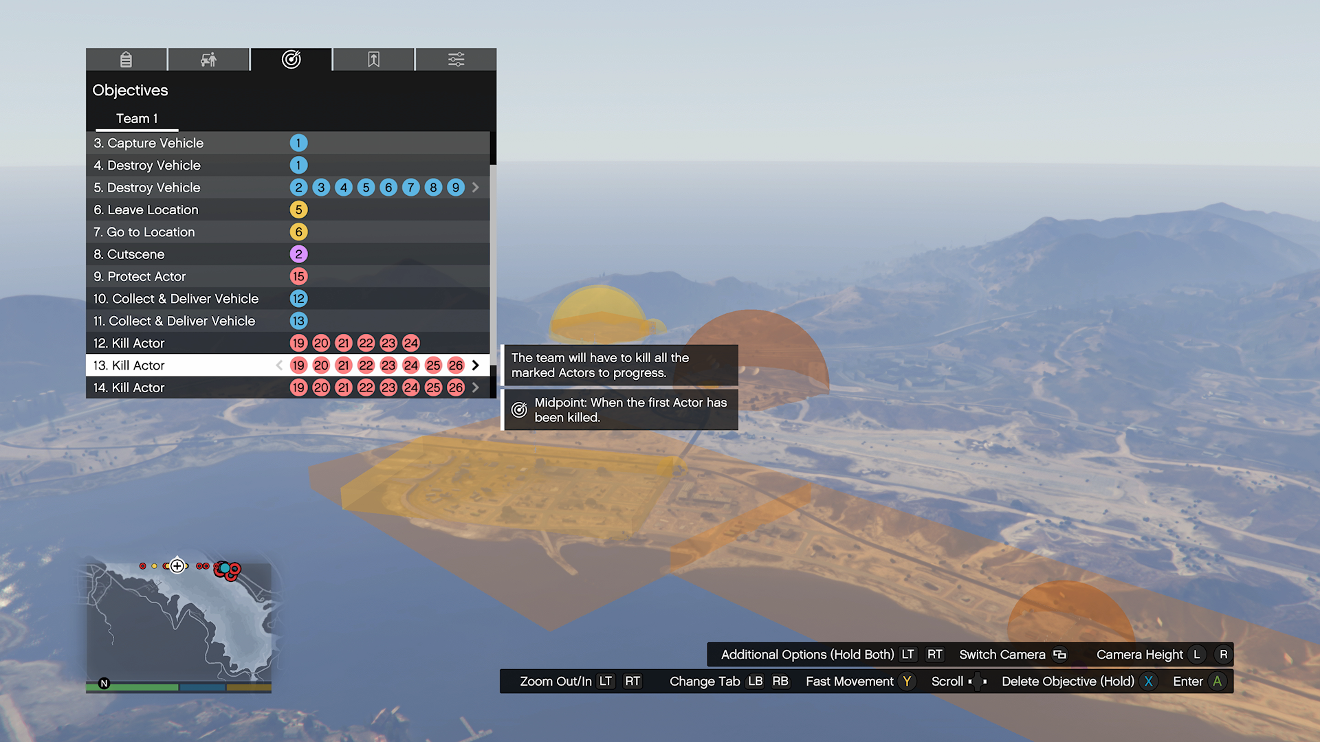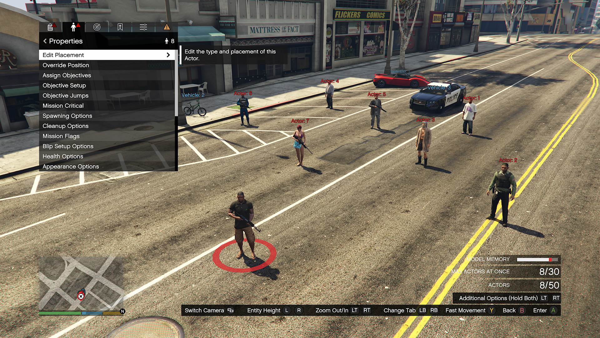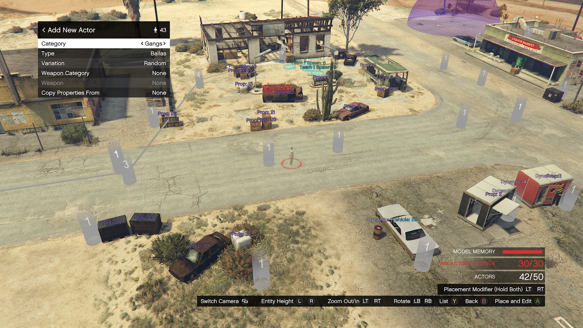 Em termos de entidades, é possível adicionar uma grande variedade de veículos, NPCs (personagens não jogáveis), objetos e outros elementos. Há um limite para a quantidade de cada tipo que pode ser adicionado, exigindo que a comunidade encontre maneiras criativas de executar suas visões dentro das restrições. Especificamente, os criadores podem incluir até 50 NPCs, 300 objetos, 32 veículos, 32 portas e 20 localizações, além de precisar considerar um limite de memória geral para suas missões.