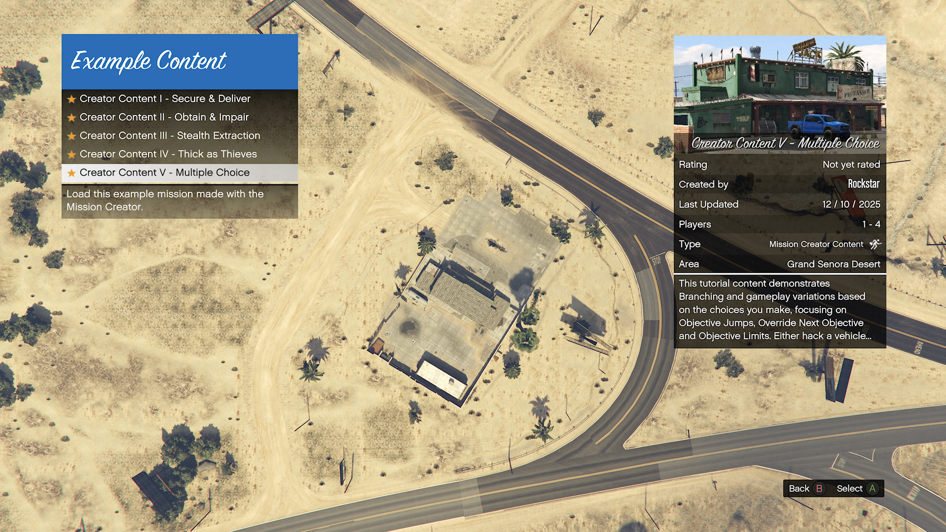 Para auxiliar os jogadores a aprenderem os fundamentos do Criador de Missões, a Rockstar Games disponibiliza suporte. A empresa criou cinco missões de exemplo, projetadas para ajudar os usuários a dominar a nova ferramenta. Os jogadores podem experimentar essas missões acessando “Online” > “Serviços” > “Jogar Serviço” > “Criados pela Rockstar” > “Conteúdo do Criador de Missões”. Além disso, é possível carregar essas mesmas missões no próprio Rockstar Creator, selecionando “Carregar Criação” no topo do menu do Criador e escolhendo “Conteúdo de Exemplo”, permitindo que os jogadores analisem como elas foram construídas.