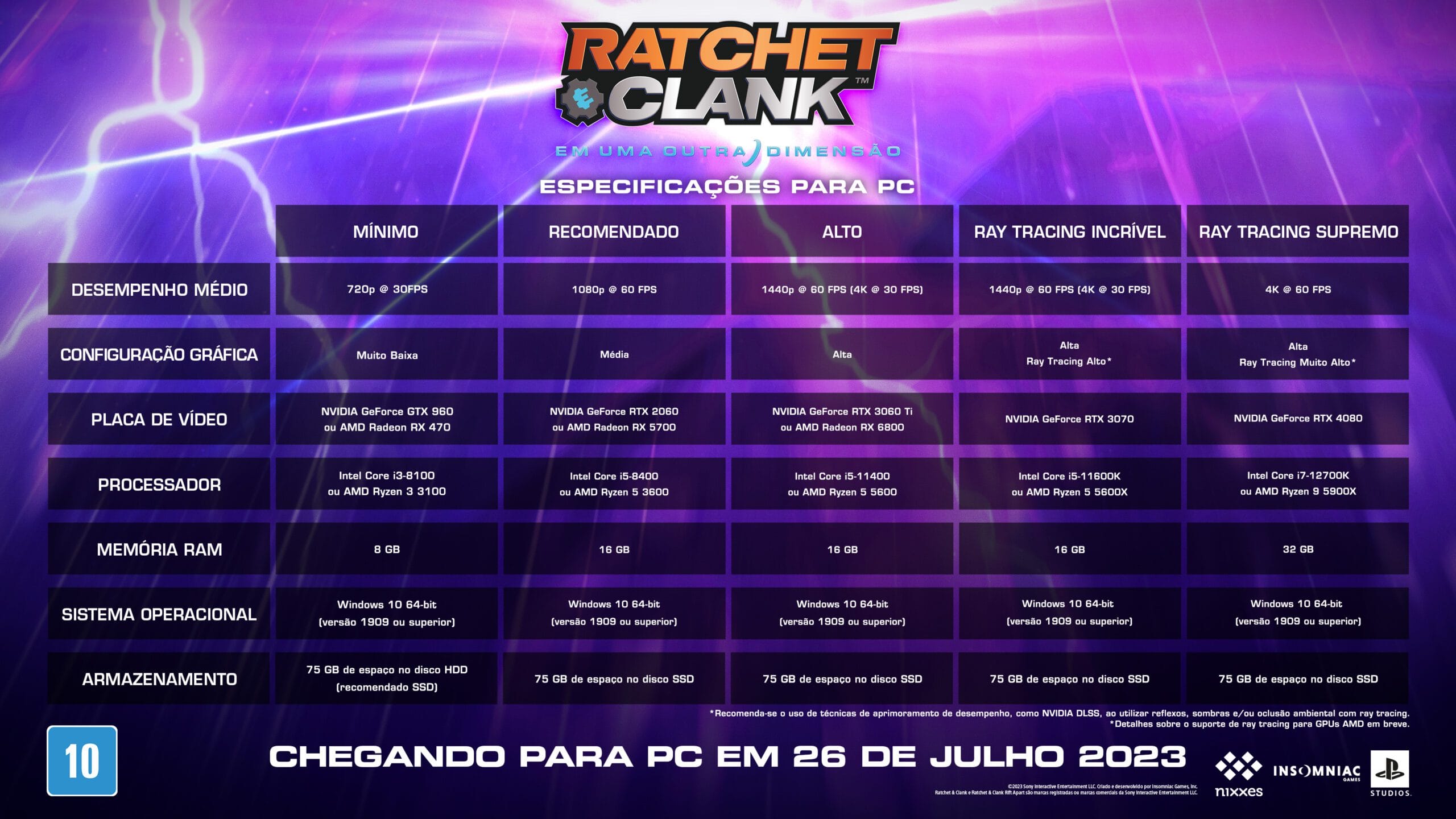 Ratchet & Clank: Em Uma Outra Dimensão será lançado para PC com vários recursos novos. Detalhes sobre tecnologias usadas e requisitos de sistema foram compartilhados pela PlayStation no blog oficial da plataforma, como a implementação do DirectStorage 1.2, incluindo descompactação de GPU.