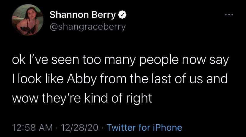 “Ok, eu já vi muitas pessoas dizerem que eu pareço a Abby de The Last of Us, e uau, eles estão meio certos”, disse em 2020