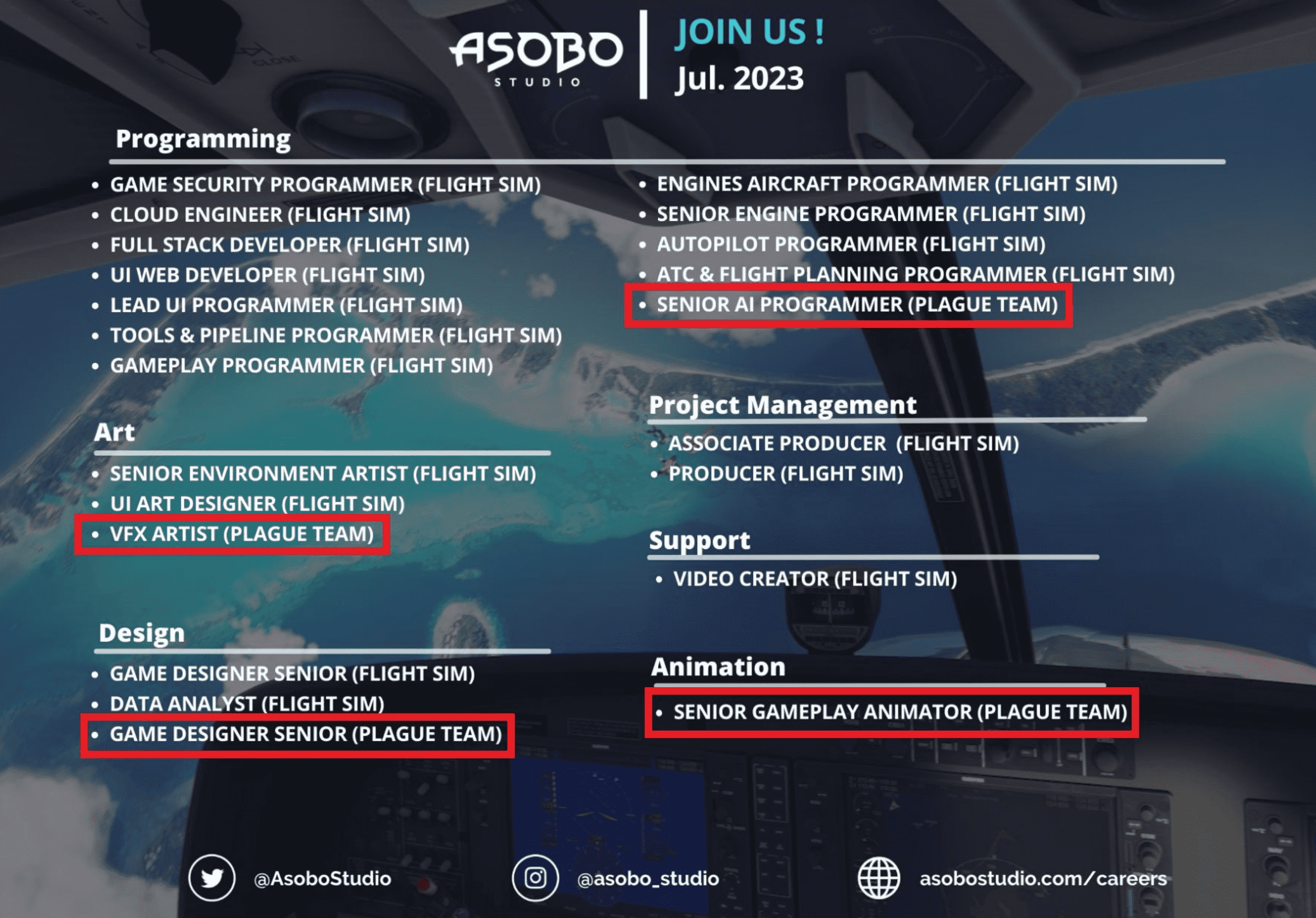A maioria das vagas são para a equipe de “Flight”, que presumivelmente trabalhará em Microsoft Flight Simulator 2024, mas quatro delas são para equipe “Plague Team”, sugerindo novo projeto da franquia.