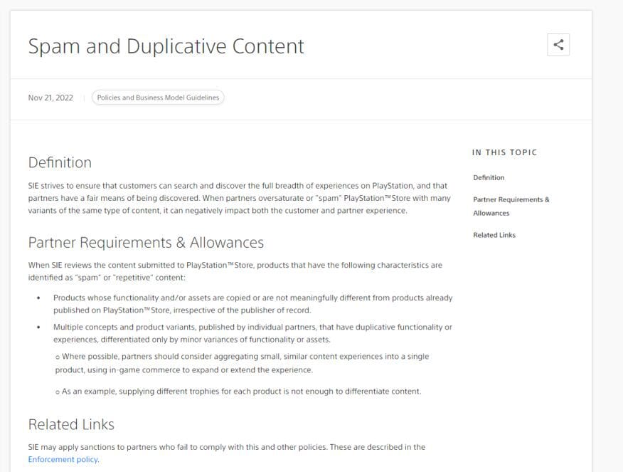 O suposto comunicado foi divulgado pelo site DexDotExe, e nele a Sony classifica esses jogos que trazem muitas variantes do mesmo tipo de conteúdo, como spams que causam malefícios aos consumidores e empresas responsáveis.